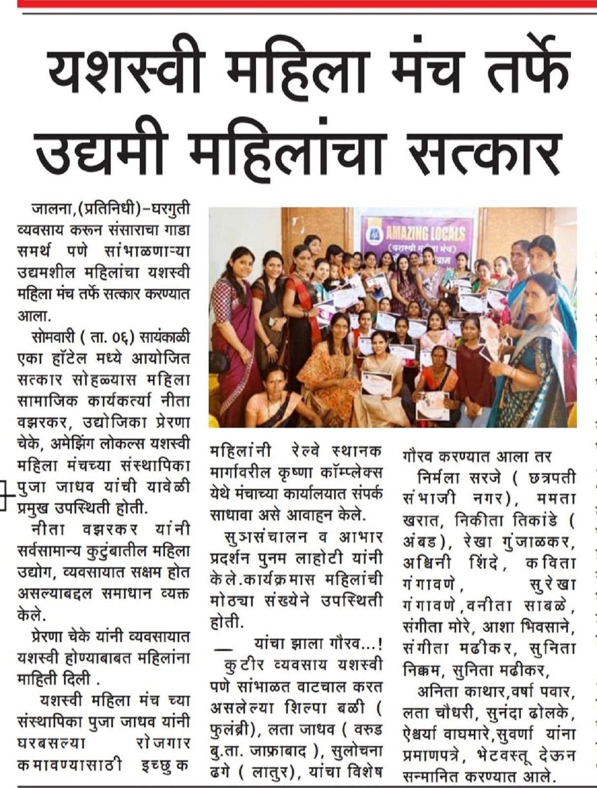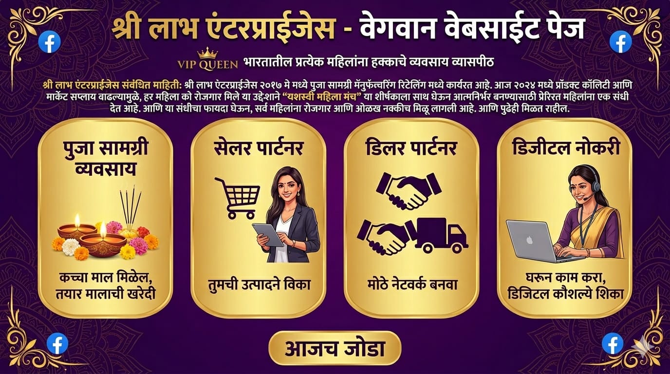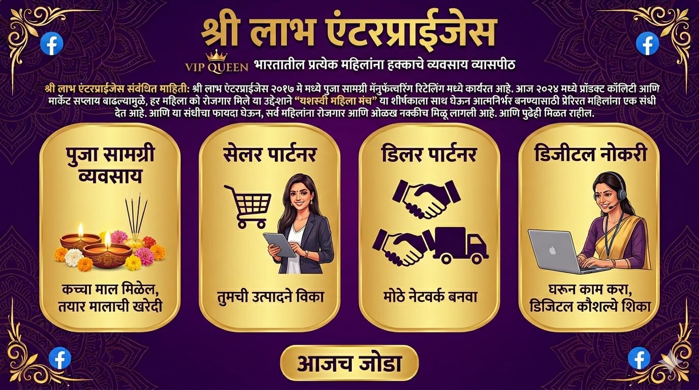श्री लाभ ऐंटरप्राईजेस 2017 मे में पुजा सामग्री मॅनुफॅक्चरिंग रिटेलिंग में कार्यरत है। आज 2024 मे प्रोडक्ट कॉलिटी और मार्केट सप्लाय बढने के कारण, हर महिला को रोजगार मिले इस उद्देश के साथ "यशस्वी महिला मंच" इस शीर्षक को साथ लेकर आत्मनिर्भर बनने हेतु प्रेरित महिलाओं को एक मौका दे रही है। और इसी अवसर का फायदा लेकर, सभी महिला को रोजगार और पहचान जरूर मिलने लगी है। और आगे भी मिलती रहेगी